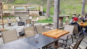 The bar and dining area is rustic and sleek. They have beautiful live-edge work, and when you visit, look up! They found a way to be creative and keep that cabin-wood feel.